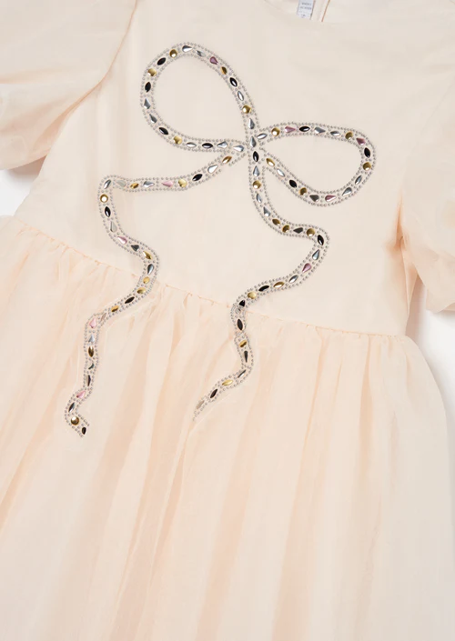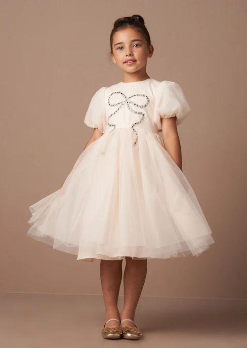 Behold the dress of dreams! Crafted from the softest mesh in an elegant champagne coloured hue. Cut into a full skirt with a gentle puff sleeve, featuring an oversize encrusted bow that steals the spotlight. Cue flash bulbs.