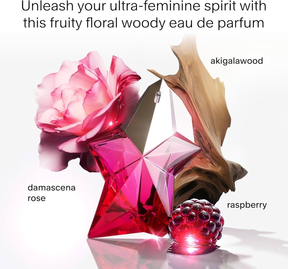 Fragrance Description: Angel Nova Eau de Parfum is an alluring feminine fragrance born from the fusion of fruity delight, an exclusive Mugler rose, and vibrant woody essence. The journey begins with dazzling top notes of raspberry overdose, tinged with the sweetness of lychee, bringing the olfactory experience to life. The Damascena rose is sublimated by a double extraction to obtain an intoxicating natural rose mixed with a unique, supernatural rose from upcycling and biotechnology. Wood notes of akigalawood and benzoin complete the alliance of nature and innovation, creating a fragrance that embodies absolute femininity. Angel Nova a tremendous Spring and Summer perfume that is long lasting courtesy of being an eau de parfum which as higher aromatic concentration than eau de toilette.