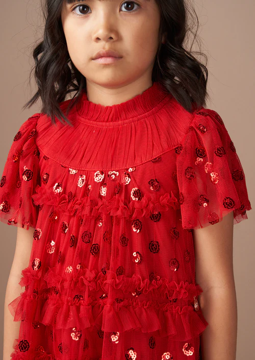 This dress is like a burst of festive cheer! With a longer length silhouette and a skirt that’s brimming with volume and tiers, it’s made for twirling! Scattered with sequins adding a touch of magic, this dress is guaranteed to spread smiles and joy wherever they go.