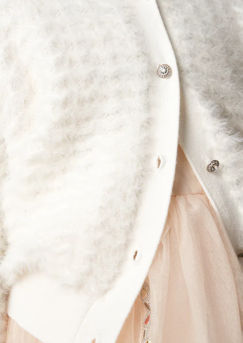 This cardigan is the ultimate layering piece. Knitted from the softest yarn into intricate patterns and finished off with pretty diamante buttons, this piece can be dressed up or down. Simply stunning!