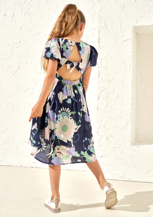 Our stunning Evita floral print dress has a high low hem line, creating a unique silhouette. Crafted from 100% cotton and featuring an oversize floral print, gentle puff sleeve and pretty cut out back detail. It’s blooming marvellous!