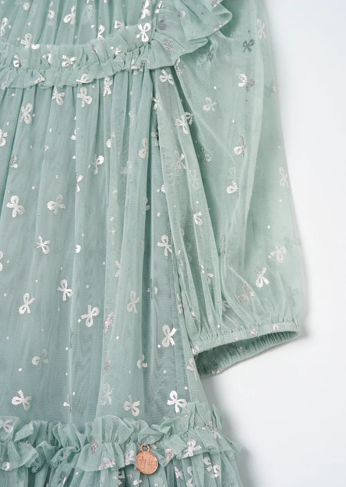 Cue flashbulbs. You will shine like a superstar in our stunning new dress. Layers upon layers of soft mint green mesh cut into a tiered silhouette and bursting with volume. Sprinkled with mini glitter bows which add extra star quality.