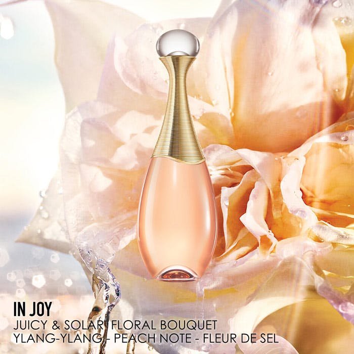 With J’adore in joy Eau de Toilette, François Demachy, Dior Perfumer-Creator, composed a fragrance with a freshness that is lively and full, soft and incisive, based on a heart of Ylang-Ylang from Madagascar and the Comoros, and custom-crafted for Dior in Grasse. A salty and unexpected fragrance. An instant pleasure exalted. A fragrant exclamation that springs forth like a declaration of love for life.