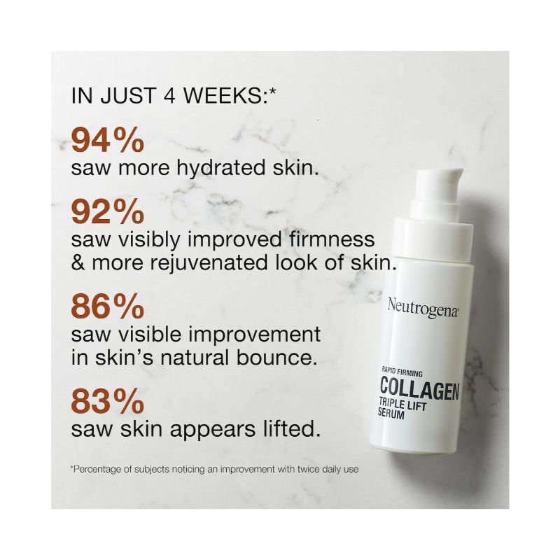 Neutrogena Rapid Firming™ Collagen Triple Lift Face Serum hydrates, smooths and visibly firms skin to restore a contoured-looking and youthful appearance. This daily face serum delivers within skin’s surface to smooth and reveal a lifted look, and visibly firmer and more contoured skin over time. Its triple action collagen formula combines pure low molecular weight collagen with AHP amino acids and an amino sugar to complement skin’s natural firming support and restore skin’s taut, youthful appearance.